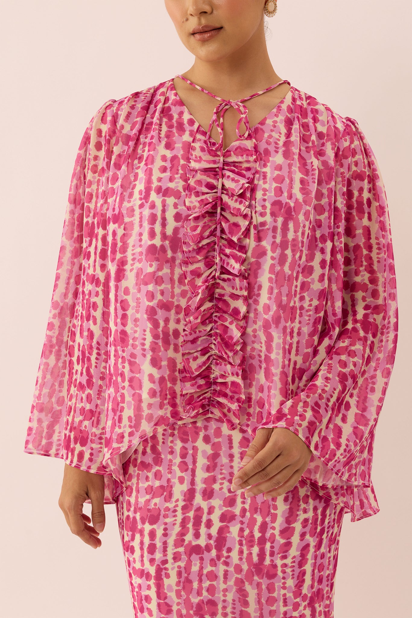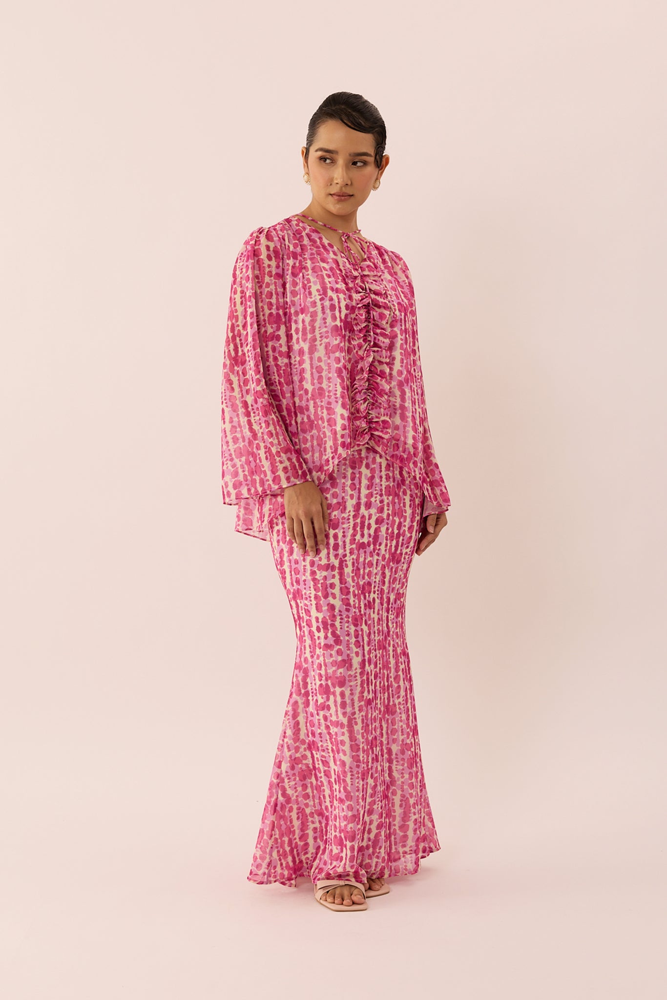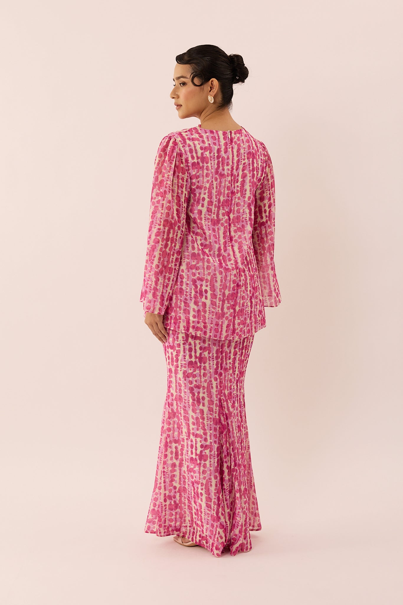 A refreshed kurung set with subtle rippling texture, creating a graceful silhouette that feels both timeless and fresh.