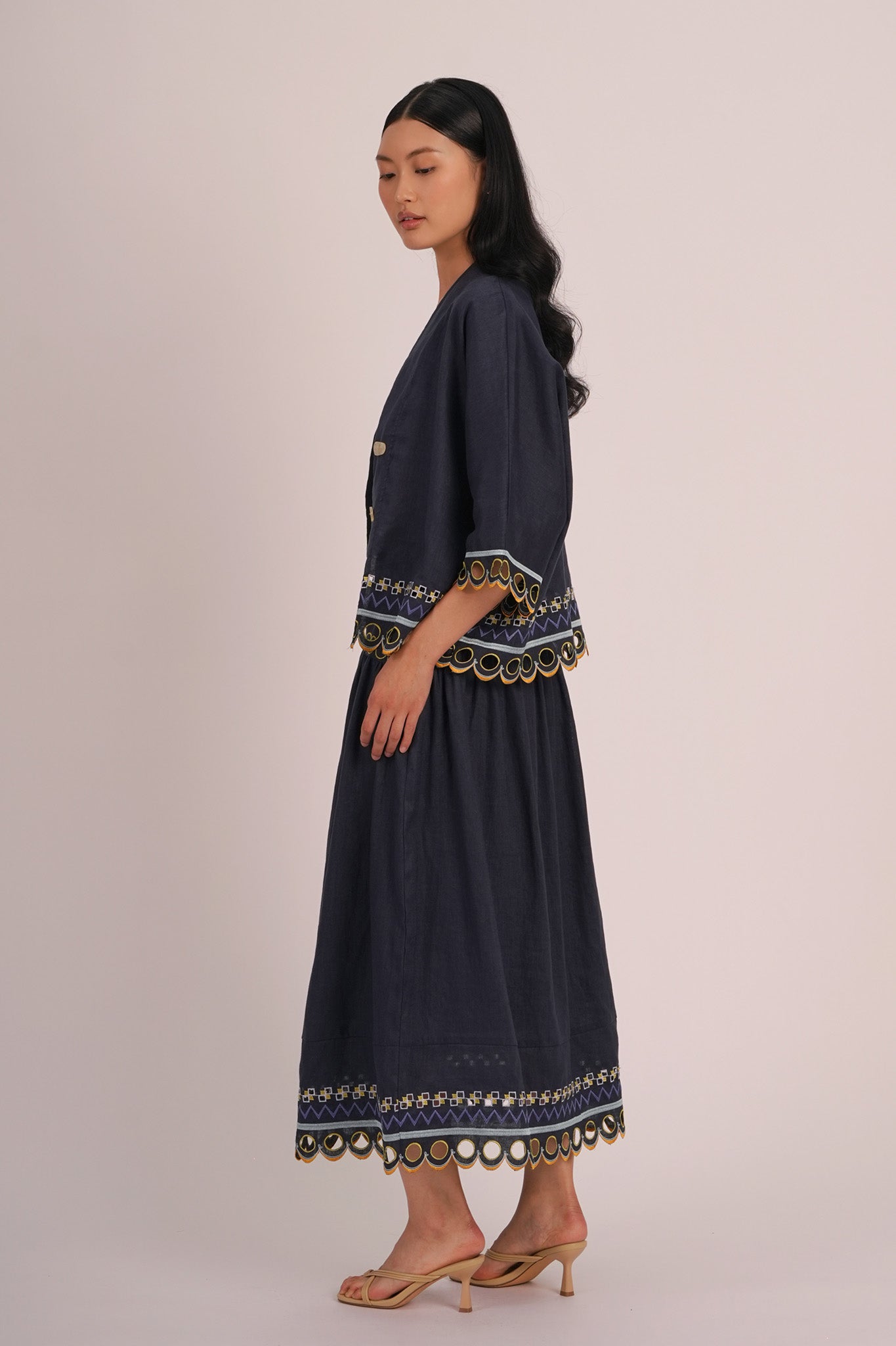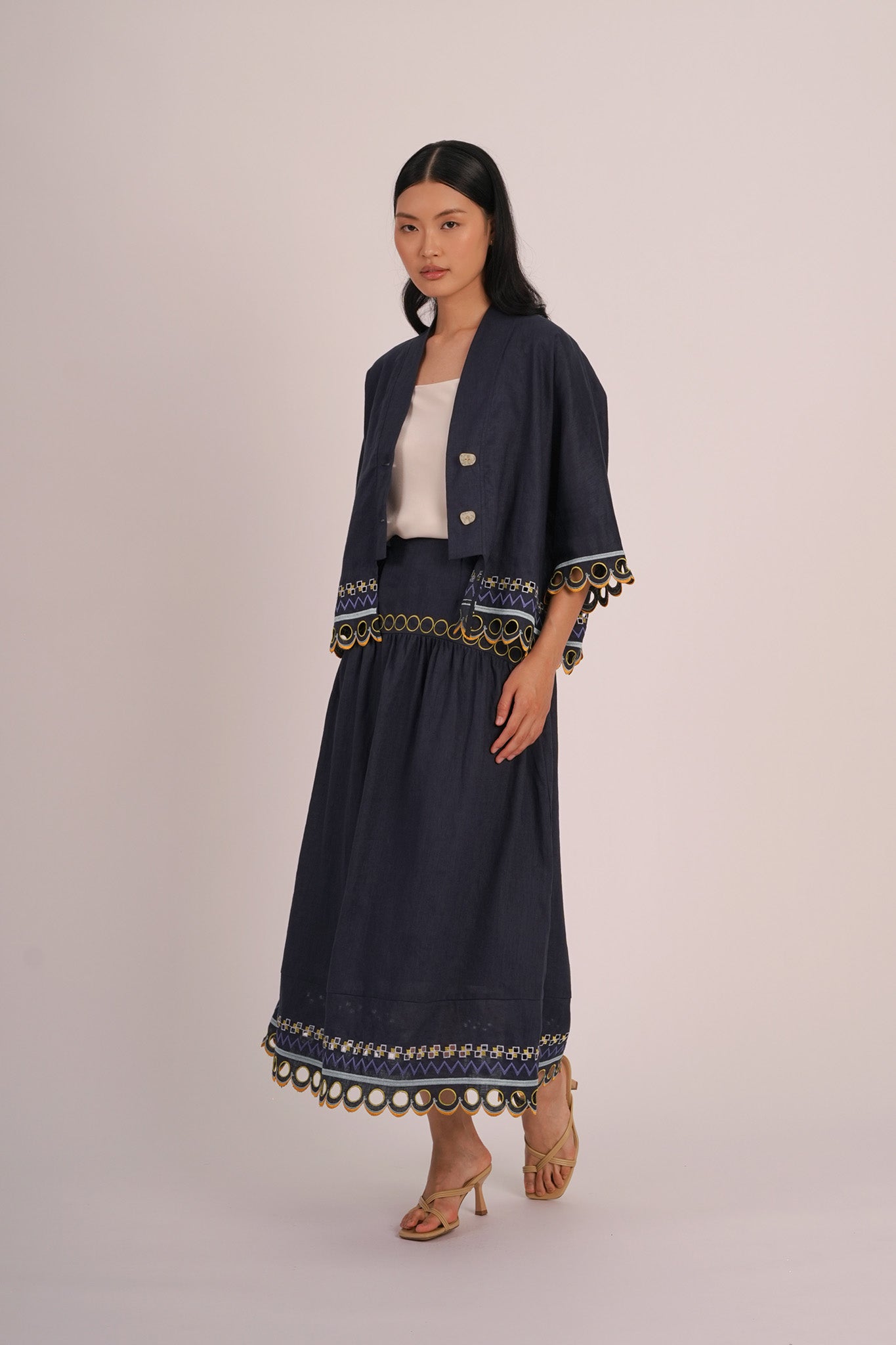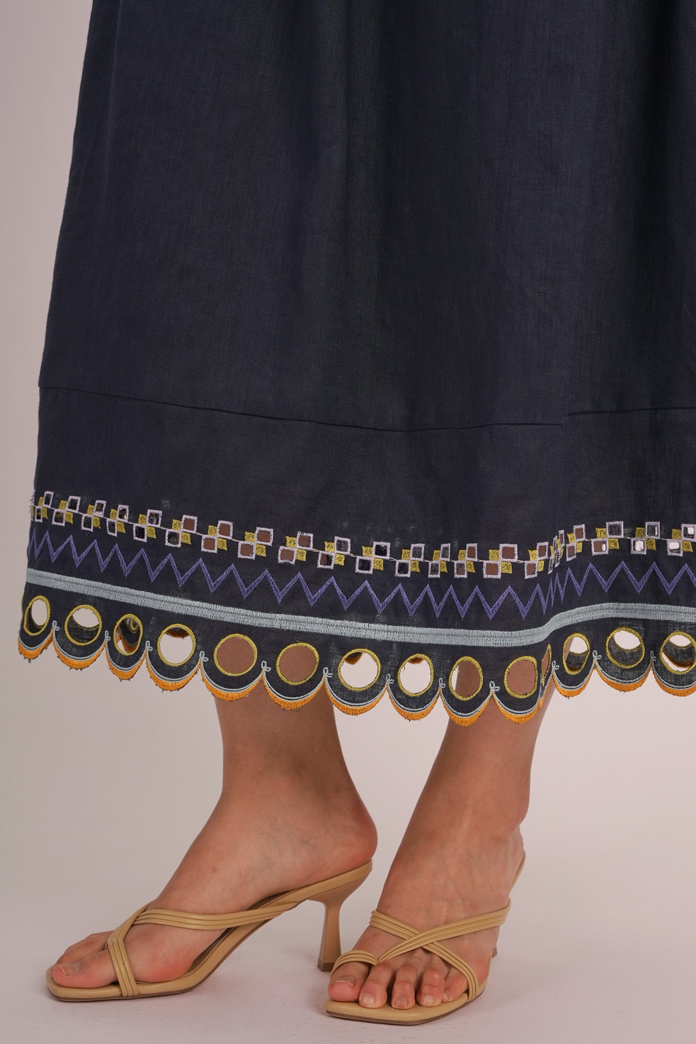 - Skirt is adorned with multicolored intricate embroidery